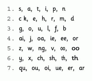 Los sonidos son enseñados en un orden específico, no alfabéticamente, lo que permitirá que los niños y niñas sean capaces de aprender a leer palabras lo más pronto posible.Estos son los grupos de sonidos que se enseñan, en este orden: